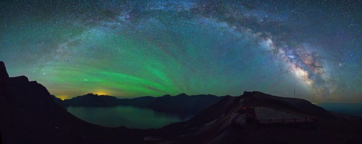 雨季,长白山,守候近半个月,终得3小时晴夜。上半夜,银河拱桥升起得尚不算高,倒是天际那如极光般梦幻的气辉,可谓锦上添花。 长白山地理气象纪录员,2013年07月06日摄于长白山西坡悬雪崖。佳能EOS 5D MarkⅢ+EF16-35mm f/2.8LⅡ,ISO 6400,16mm,F3.2,25秒,7张竖幅横向拼接。