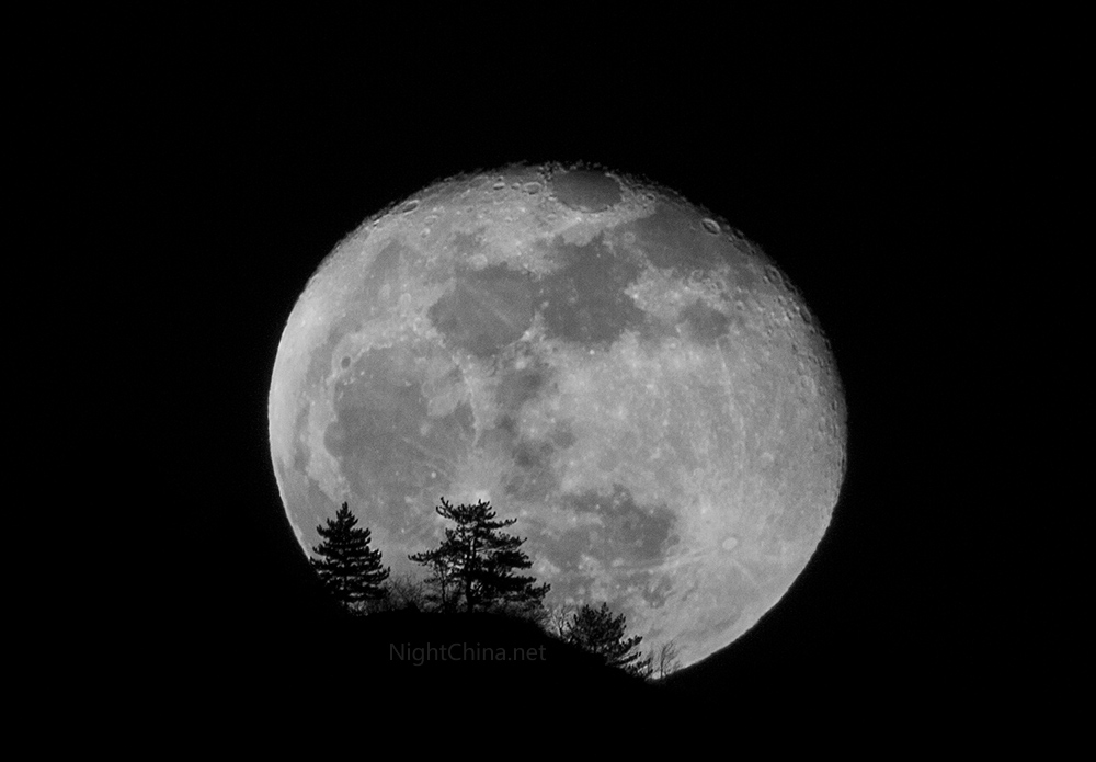 月亮刚刚从山头升起,山梁上的松树在月亮前方,遮出了一系列剪影。又是一年中秋月圆,月亮上的玉兔你还好吗?