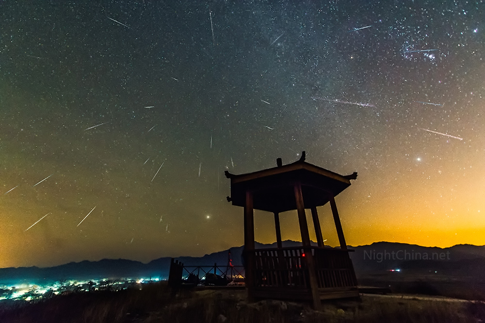 李召麒,2014年12月13日摄于北京延庆柳沟。尼康D4S + 14-24镜头,ISO 8000,f/2.8,8秒,28张流星叠加。