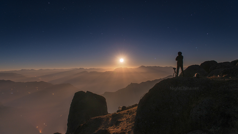 月落时分,最后的月光照亮了地面与山间,一位摄影师正在捕捉山间出现的光束。