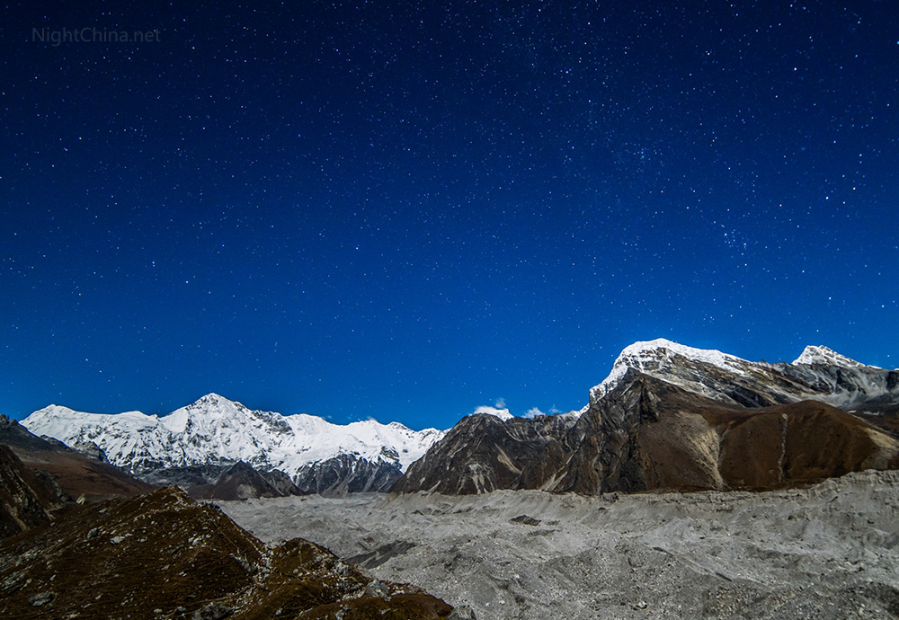 孤独的夜晚,月明星稀,银河横挂在天边依稀可见,横跨在眼前的则是以世界第六高峰卓奥友峰(8201米)为主的喜马拉雅群峰。