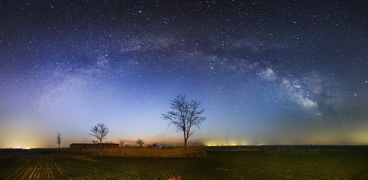 阴历二月初二,龙抬头。黄河以北一处少些光污染的返青麦田。黎明时分,星河之下,即将晨起的村庄。