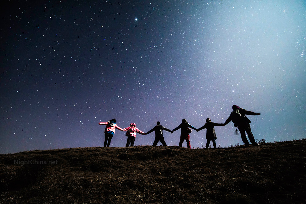 大山包的夜晚风沙不止,猛然间甚是有在火星上漫步的感觉。朋友的相伴让追星的夜晚不再孤独,六人手拉着手沐浴在月光下,我们是穿梭在银河的火箭队!