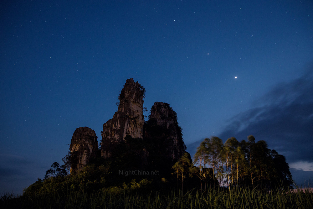 昏影尚未退去,天空已是深邃的蓝色。点点星光次第点亮,像缀在蓝色天鹅绒上的钻石。西边天空中排成一条直线的金星、木星和轩辕十四是最闪亮的三颗。路边不知名的石山正好也有高矮不一的三座山峰,和天空中的三颗亮星遥相呼应,相映成趣。