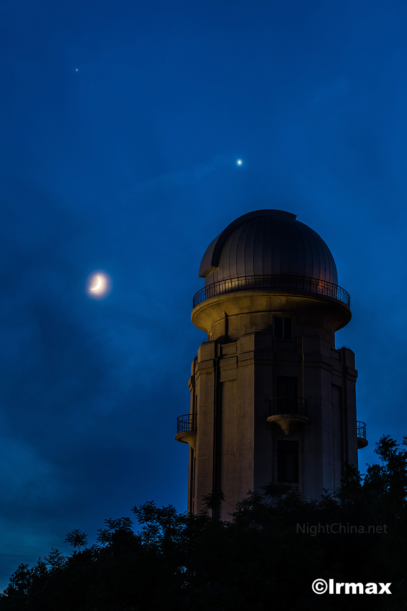 农历五月初五,湛蓝夜空中,金木二星同峨眉新月形成三角,一层薄云给它们披上朦胧的面纱。始建于1931年的清华大学天文台(原为气象台),遥望着这双星伴月的天文景观。