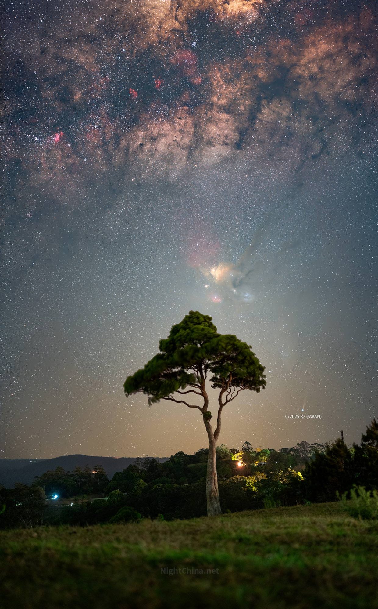 宇宙中的两种孤独在此相遇:一棵扎根大地的树,数十年如一日守望天空;一颗来自冰冷边疆的彗星,用几百年完成一次回归。它们在阳光海岸的夜空下交汇片刻,树仰望,彗星俯瞰,银河见证,然后各自继续漫长的等待与流浪。