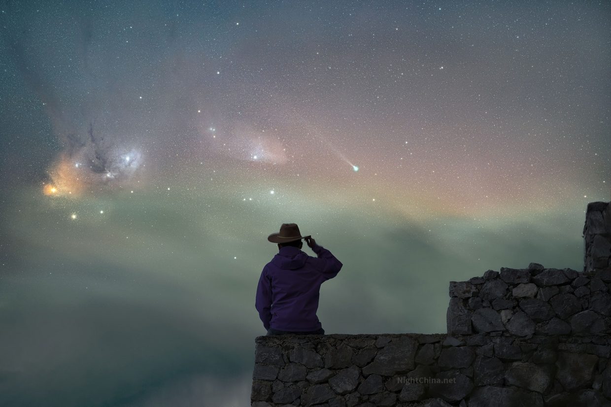 暮色未尽,月光未至,SWAN彗星恰好路过。它拖着幽绿色的长尾,从46亿年前太阳系形成时遗留的奥尔特云深处赶来。石墙、旅人、星河,还有这颗编号C/2025 R2的彗星——宇宙偶然编织的一帧画面,定格成了这浩瀚的星空画卷。