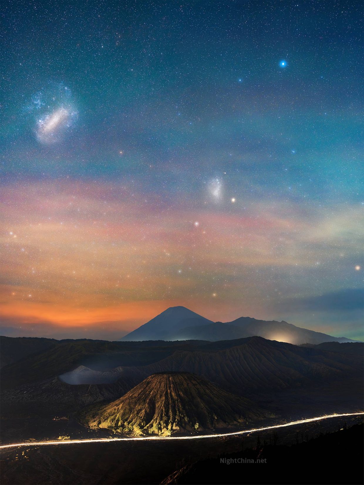 黎明前的黑暗中,沉睡的火山群吐纳着大地的气息,深处是躁动不安的脉搏。它们之上,南天星空静谧流淌,大小麦哲伦云如两颗晶莹的宇宙宝石,与漫天星辰一同,镶嵌在红绿色气辉交织的夜幕上。