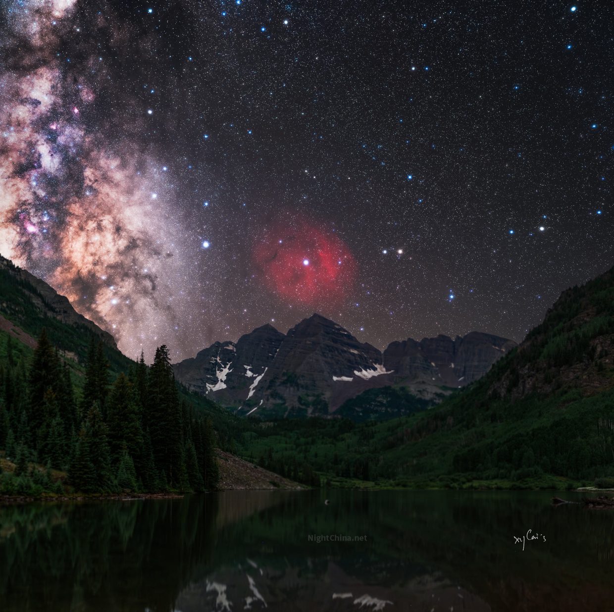 马龙湖的7月深夜,凄冷而纯净。双子峰剪影如墨,峰顶却悬着一团来自深空的红色星云。那是Sh2-27,距离地球数千光年的宇宙火焰。银河倾泻而下,星光穿越时空,落在科罗拉多的雪山与湖水之间。寒与暖,远与近,在这一刻重叠。
