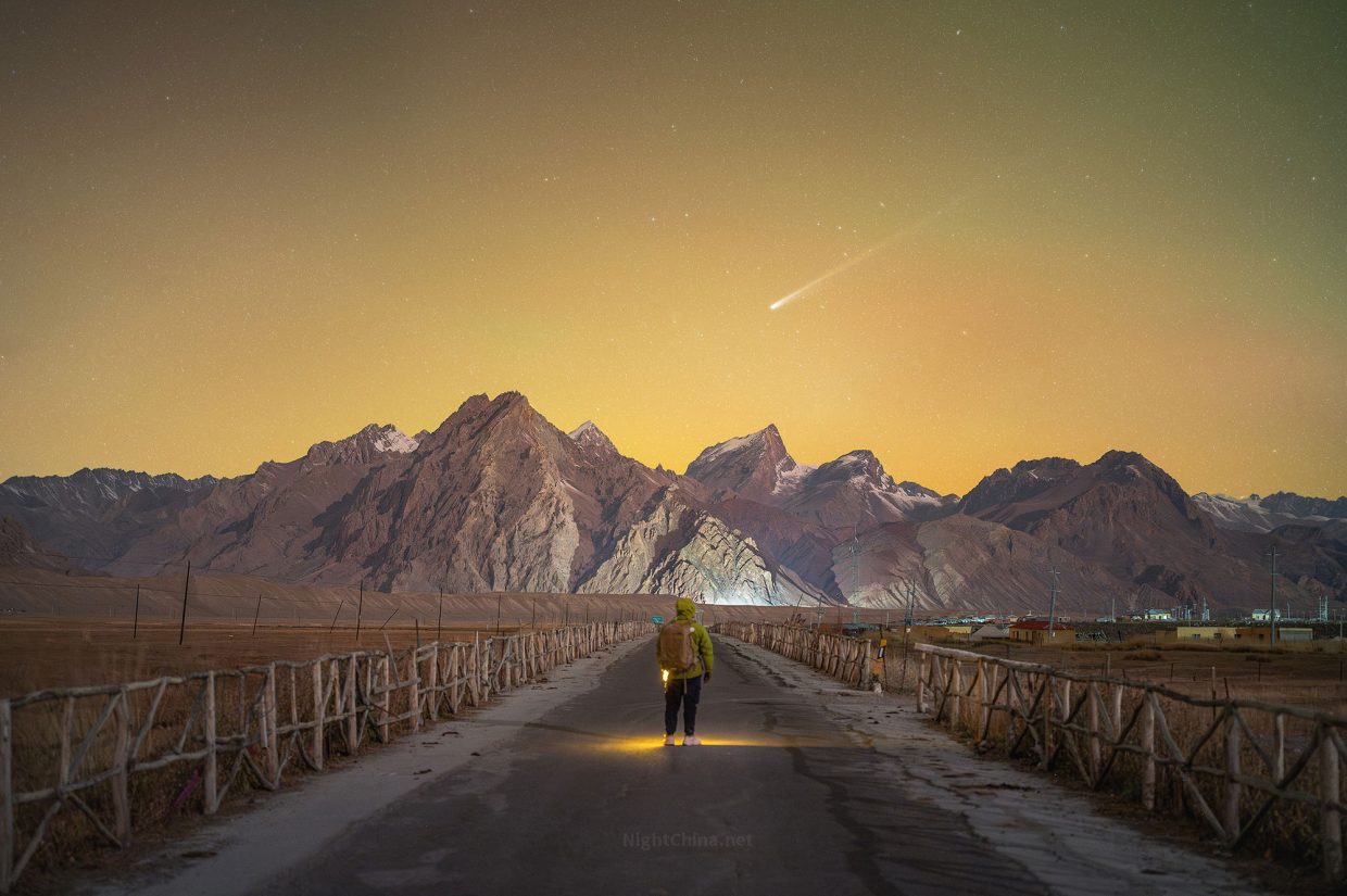 在帕米尔高原的薄暮里,莱蒙彗星悄然而至。一年前的紫金山彗星仿佛还在昨日,而时间就这样安静地流淌。站在这条孤独的路上,突然明白:宇宙用彗星写信,而我们用等待作答。时空是直线也是圆圈,所有的光年之外,我们终将会相遇。