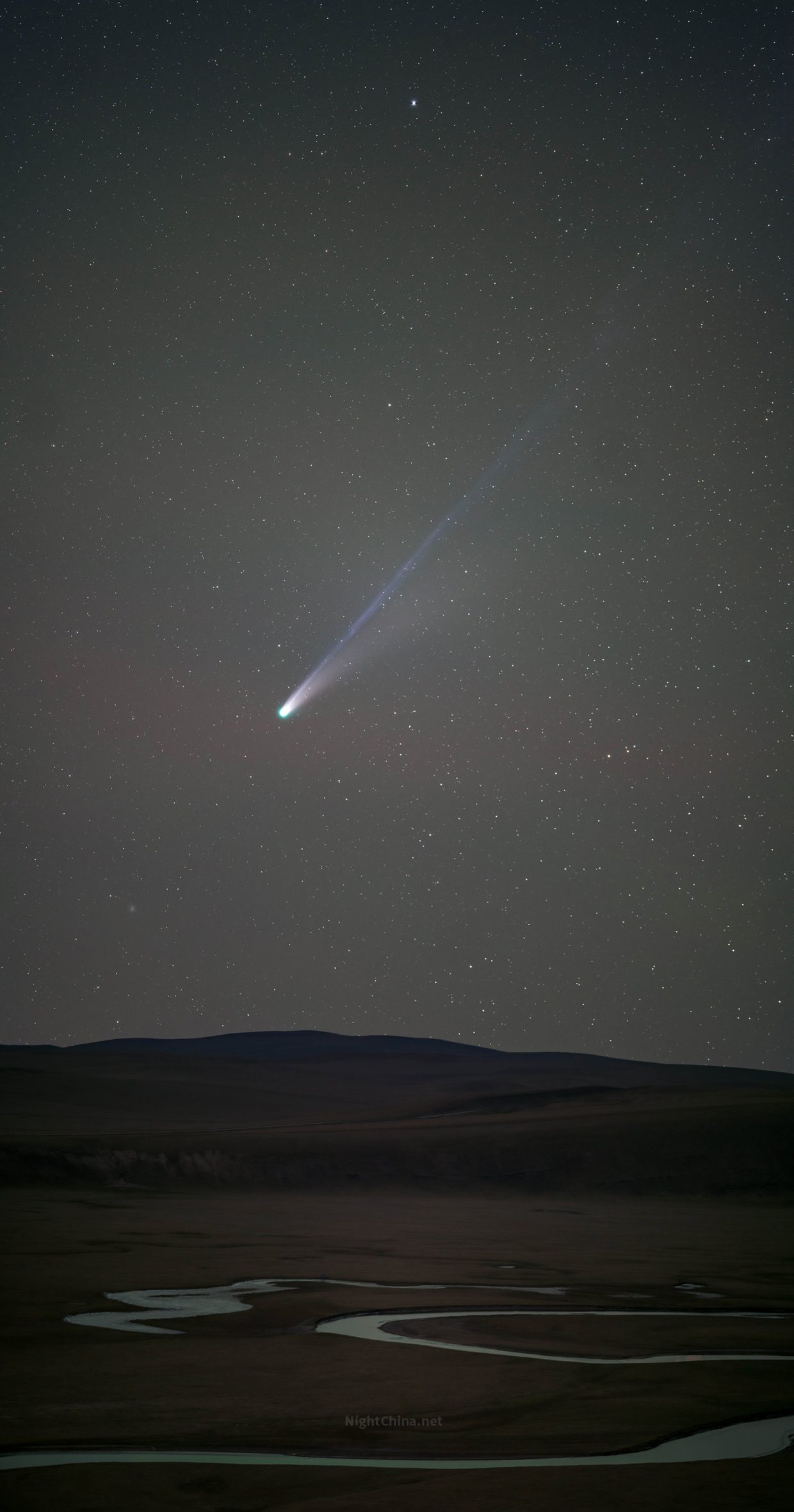 莱蒙彗星悬于夜空,尾迹如光之河。河流向远方蜿蜒,映照亘古星光。彗星是宇宙来客,生命是流淌的河。这样的相遇不会重复,它成为时间中的路标,标记着这一年,这一刻。