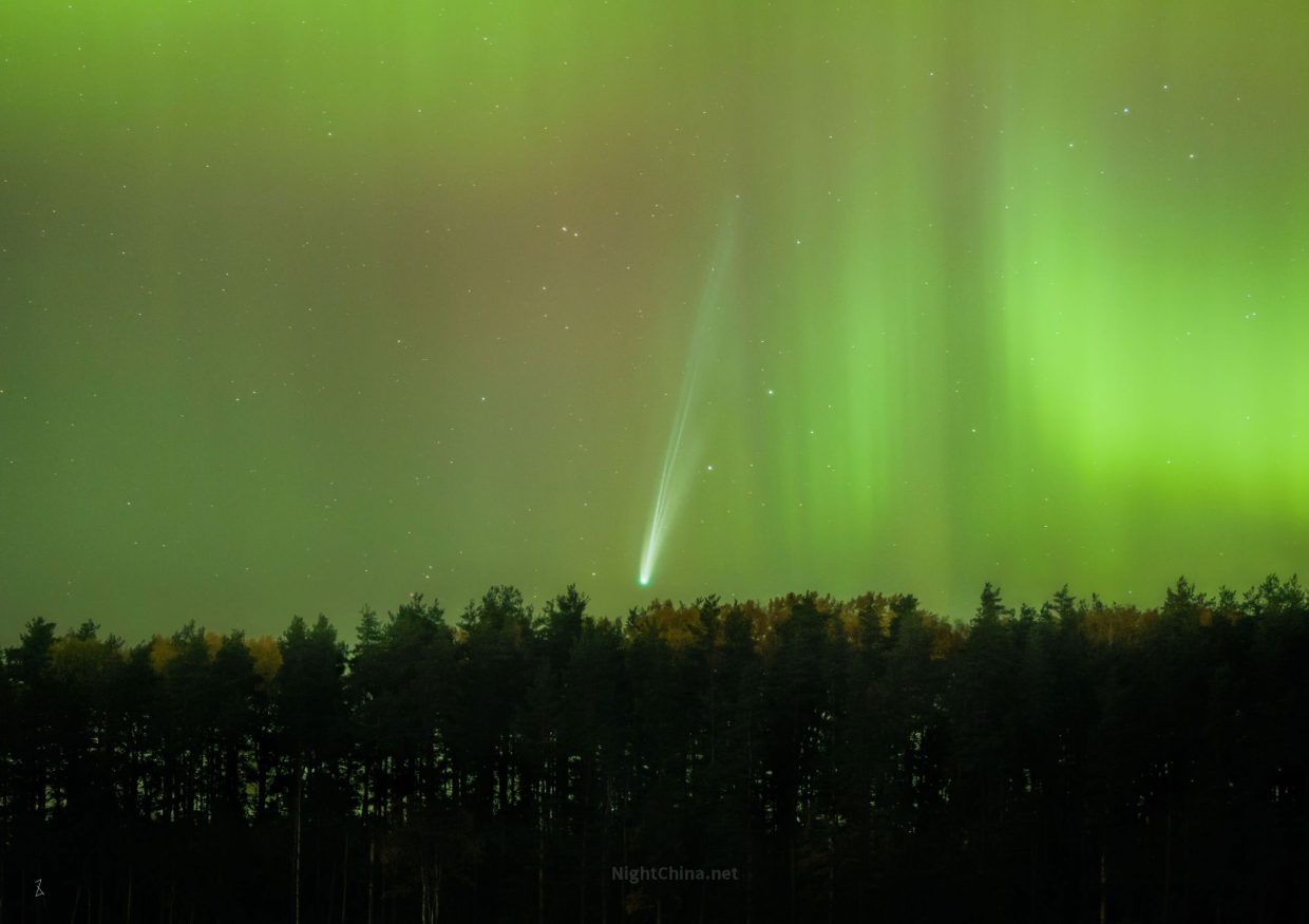 北风打磨过的夜空,清澈而安宁。 斯堪的纳维亚的秋林之上,极光如绿色的帘幕悄然垂落。夜色深处,一位远道而来的旅者正拖着长长的彗尾,划过树梢。 这是一场宇宙级的相逢。 极光铺陈了舞台,彗星翩然赴约。光与尘,在寒冷的北境交汇,万籁俱寂中,只听见宇宙缓慢而坚定的呼吸。我们仰望,被这场冷色的奇遇轻轻点亮。