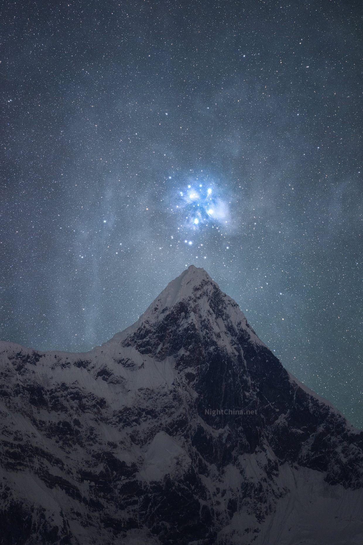 南迦巴瓦峰,这座海拔7782米的圣洁雪山,如金字塔般耸立于天地之间。金牛座的昴星团恰好升至它的顶峰,如同一捧蓝色的钻石,在山巅之上璀璨绽放。雪峰的冷峻与星团的幽蓝交相辉映,尽显宇宙的浩瀚与神圣。