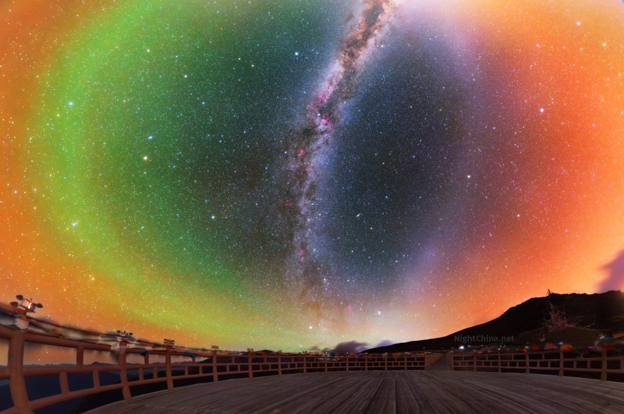 橙红与翠绿的气辉,在夜空中交织成一幅流动的画卷。银河自天心倾泻,黄道光在一旁泛起微芒。风拂经幡,三神山静默如祈,天地仿佛在同一呼吸间闪烁。