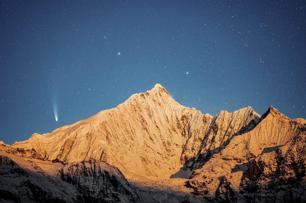 皓月初升,山巅已被金光点燃。彗星从星海深处来访,长尾扫过卡瓦格博的雪岭。冰与火在此相遇,夜与昼在此交汇,天地壮阔如史诗的一页。