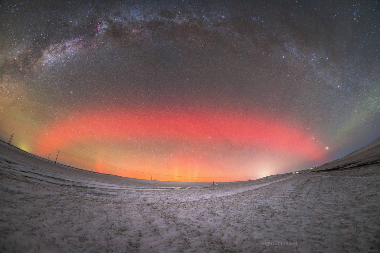 寒冷的冬夜雪原之上,北方天空上演着一场天象盛宴。璀璨的银河拱桥高悬,下方是一道罕见的红色极光弧,伴随着因地磁活动而舞动的极光。三者以一种充满秩序的对称美感,共同点亮了北方的夜幕。