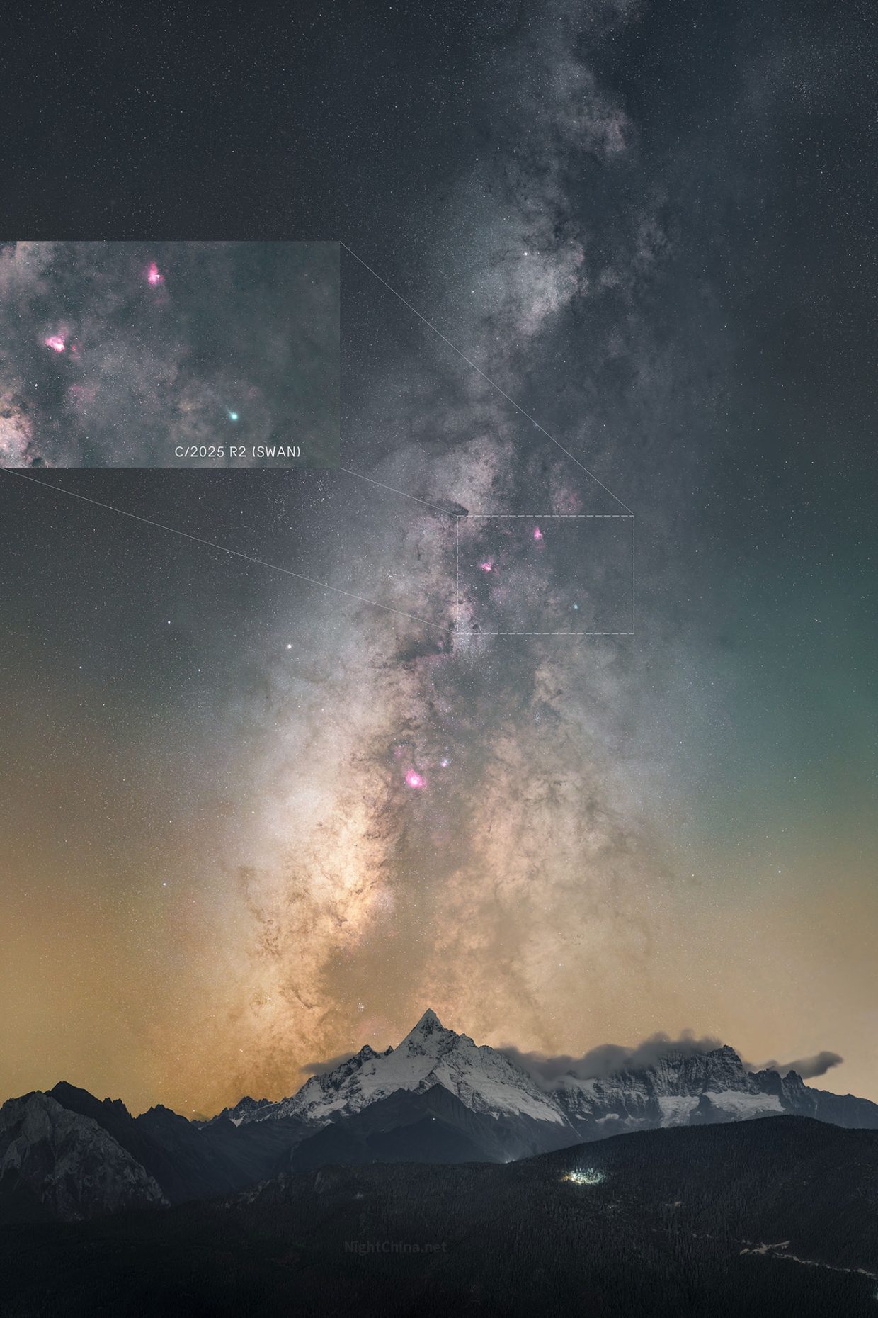 在经幡静止的夜里,缅茨姆峰仿佛以冰川为衣,立于万物沉息处。银河如圣洁的哈达自天穹垂落,星光在峰顶汇聚成祝祷。那道淡绿的光, C/2025 R2(SWAN)彗星,是来自太阳系边缘的“转经筒”。祝福被刻进冰川,随风送往所有心怀敬意的人。