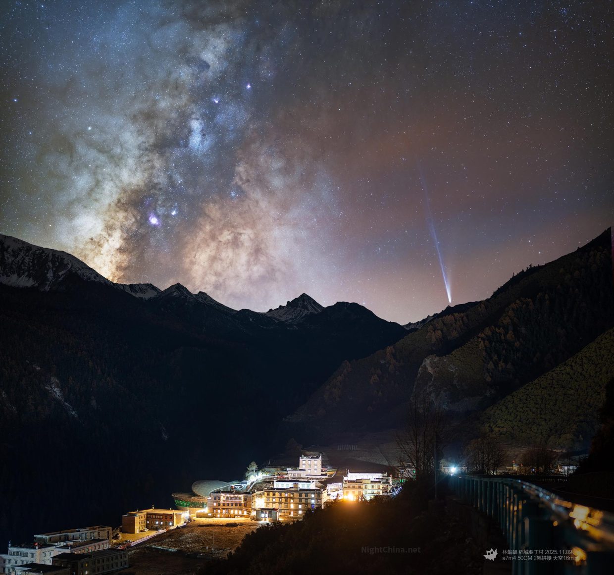 夜色吞没了游客的喧闹,亚丁村终于安静下来。灯火铺开在山谷之间,与远处的雪峰一同沉睡。头顶的天空却悄悄热闹起来:银河在群山之上铺展光辉,C/2025 A6 莱蒙彗星则拖着蓝色离子尾与弯曲的尘埃尾,仿佛一位远道而来的星际旅人,正从苍穹深处俯冲而下,要在入梦前亲吻这片古老的土地。