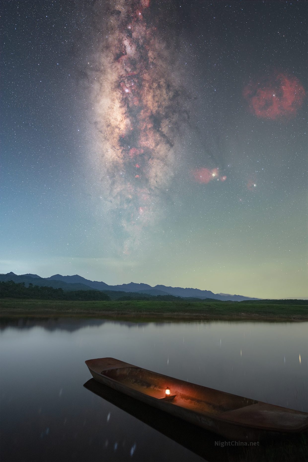 杨轲,2025年9月12日摄于 广西 崇左市那匿水库。天空部分:尼康D810(改机)+ 适马14-24 2.8,焦距24mm,ISO 4000,f/2.8,单张曝光30秒,赤道仪跟踪,10张堆栈;地景部分:尼康D850 + 适马14-24 2.8,焦距24mm,ISO 4000,f/2.8,曝光30秒。