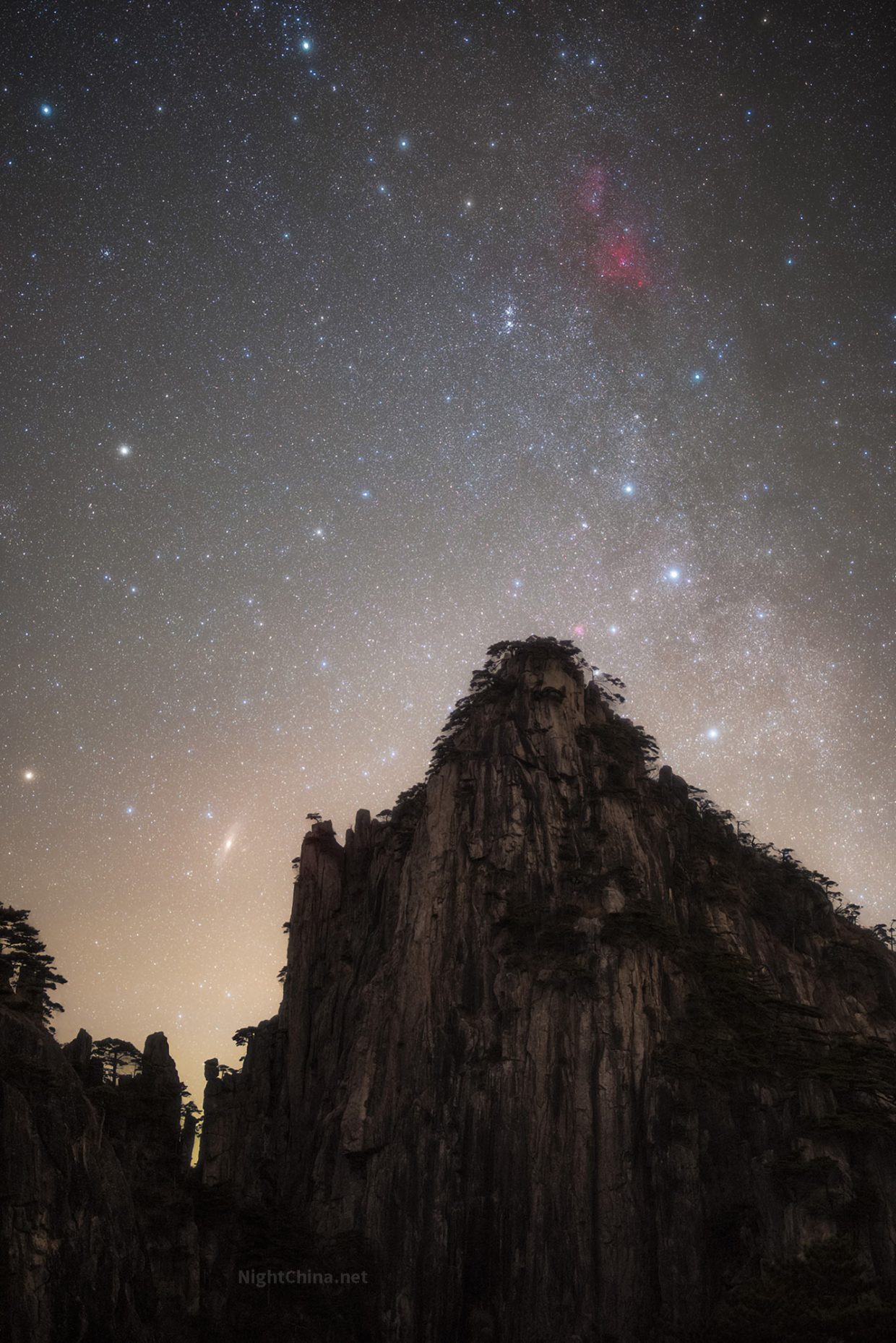 戴斯哲,2025年11月21日摄于 安徽 黄山。尼康D750(天文改机)+ 腾龙35 1.4 sp,天空部分:ISO 1600,f/1.4,单张曝光30秒,5张堆栈;地面部分:ISO 400,f/1.4单张曝光120秒,3张堆栈。