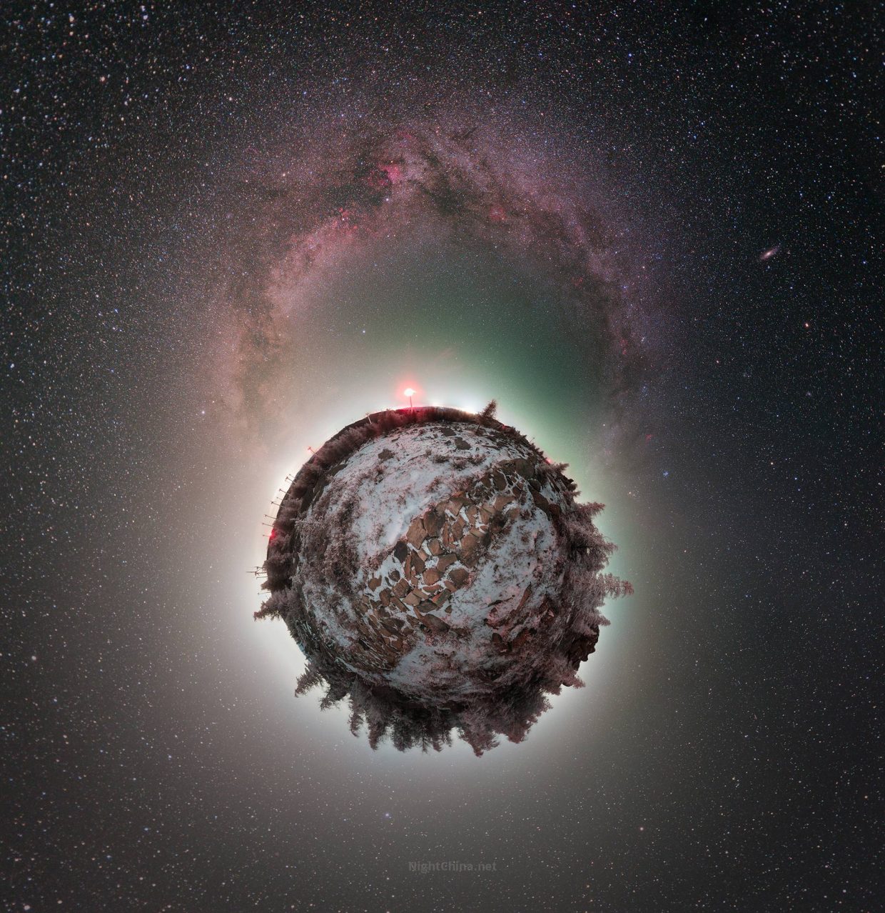 当地平线悄然收拢成圆,世界以“小星球”的方式折叠。覆雪的山脊与缀满霜华的树影蜷缩在中心,仿佛宇宙掌心的一粒微尘。而那条璀璨的银河,弯成一道光环,像是为这片人间加冕。我们在尘埃之上,亦在星海之中。