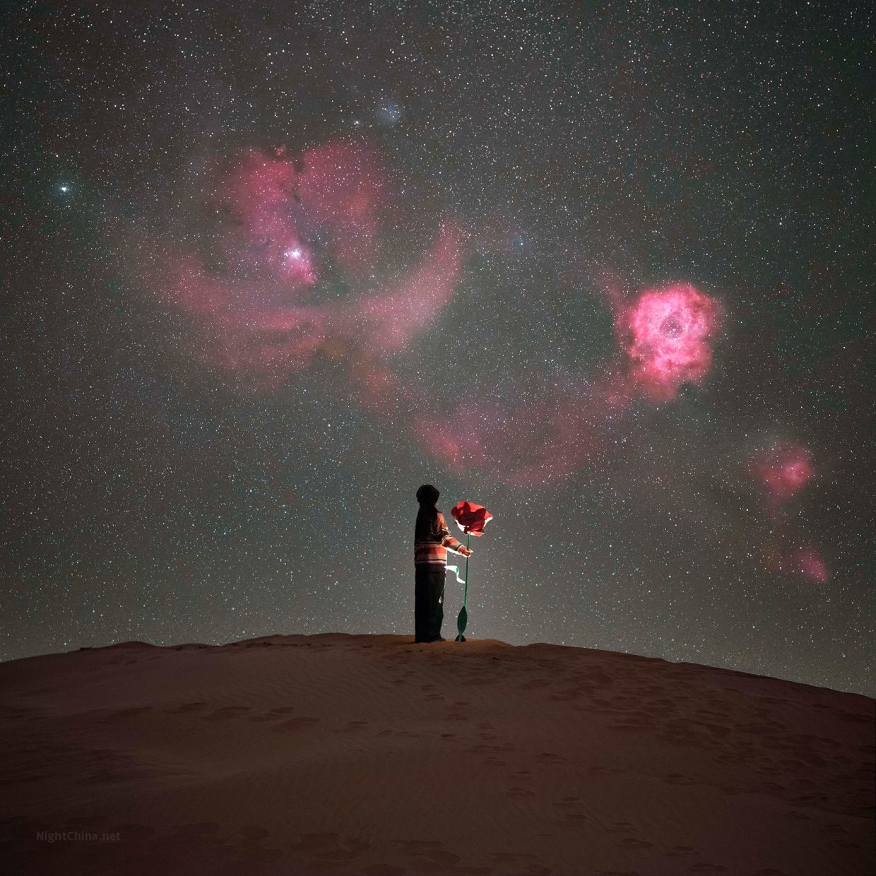 魏华,2025年12月14日摄于 内蒙古 阿拉善左旗。索尼a7r1(天文改机)+ 三阳135mm镜头 + 星源赤道仪,天空部分:ISO 1000,f/2.2,单张曝光120秒,21张堆栈;地景部分:ISO 1000,f/2.2,单张曝光30秒,4张堆栈;人像部分:ISO 6400,f/2.2,单张曝光8秒。