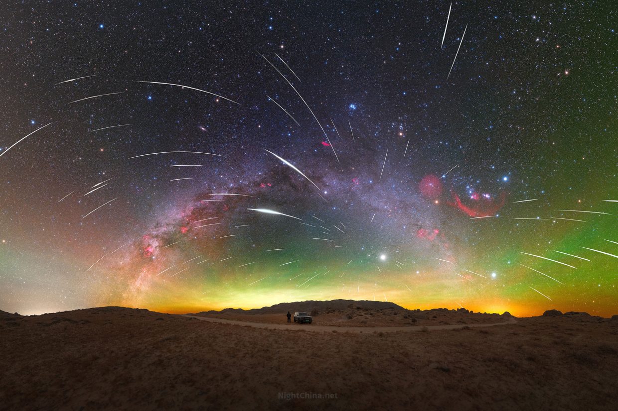钟锐恒,2025年12月13日摄于 内蒙古 阿拉善盟阿拉善右旗307国道附近。尼康z62(改机)+ 美科24.4Mix,天空底图:ISO 2000,f/1.4,单张曝光60秒;地景底图:ISO 4000,f/1.4,单张曝光30秒;28张拼接;流星:多机拍摄,ISO 8000-12800,单张曝光8-10秒,120张对齐星点叠加。