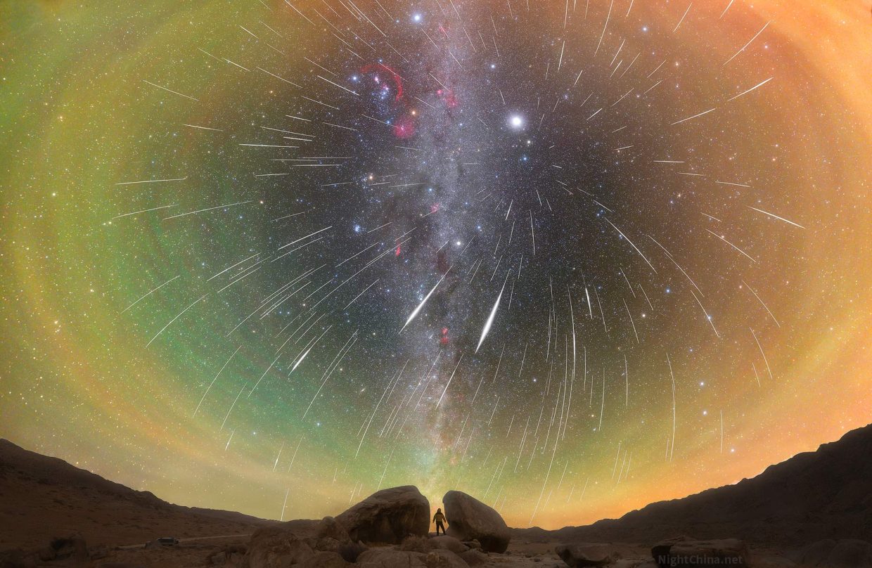 潘浩强,2025年12月14日摄于 内蒙古 阿拉善盟阿拉善右旗307国道附近。尼康Z7(改机) + 尼康 20 1.8 + bear 2号柔焦镜 + ASTERRA 赤道仪,天空部分:ISO 1600,f/1.8,单张曝光90秒;地景部分:ISO 3200,f/1.8,单张曝光60秒;底图多张拼接;流星部分:多机拍摄,ISO 800-12800,单张曝光8-10秒,对齐星点叠加。