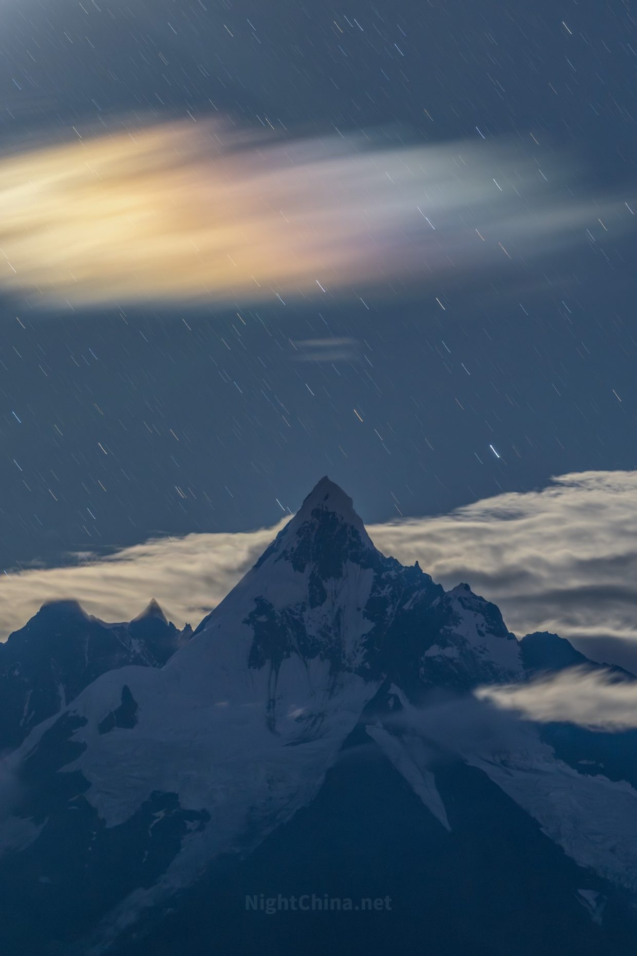 缅茨姆峰静伫于云海之巅,在月光的轻抚下愈显圣洁。苍穹之上,星辰被时光拉伸成细碎的丝绒,如雨般无声洒落。飘渺的云霭捕捉了月华中瑰丽的色散,在雪峰上方晕染出虹彩般的层叠。在这里,瞬息万变的流光与万古沉寂的雪山温柔共存。