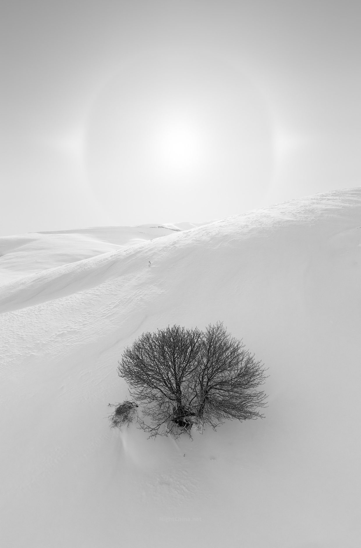 寒潮带来的降雪尚未停歇,阳光穿透厚重的云层与纷飞风雪,投射在早已银装素裹的山间。持续的极寒将大气中的水分凝结成细碎冰晶,它们随风起舞,在乳白色的天幕上折射出明亮的日晕与幻日环。这是冷空气留下的光影信笺。