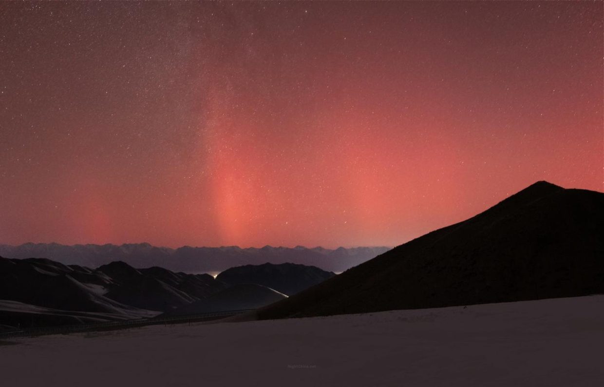 雪夜静谧,深红色的极光如轻盈的羽翼,在北方地平线上的群岭间悄然跃动。即便是在中纬度地区,大气的上层依然被来自太阳的能量点燃,呈现出如梦似幻的红色光影。巍峨的山峦在星光下屏息凝神,见证着这场跨越亿万公里的能量,在荒野天际写下的壮丽诗篇。