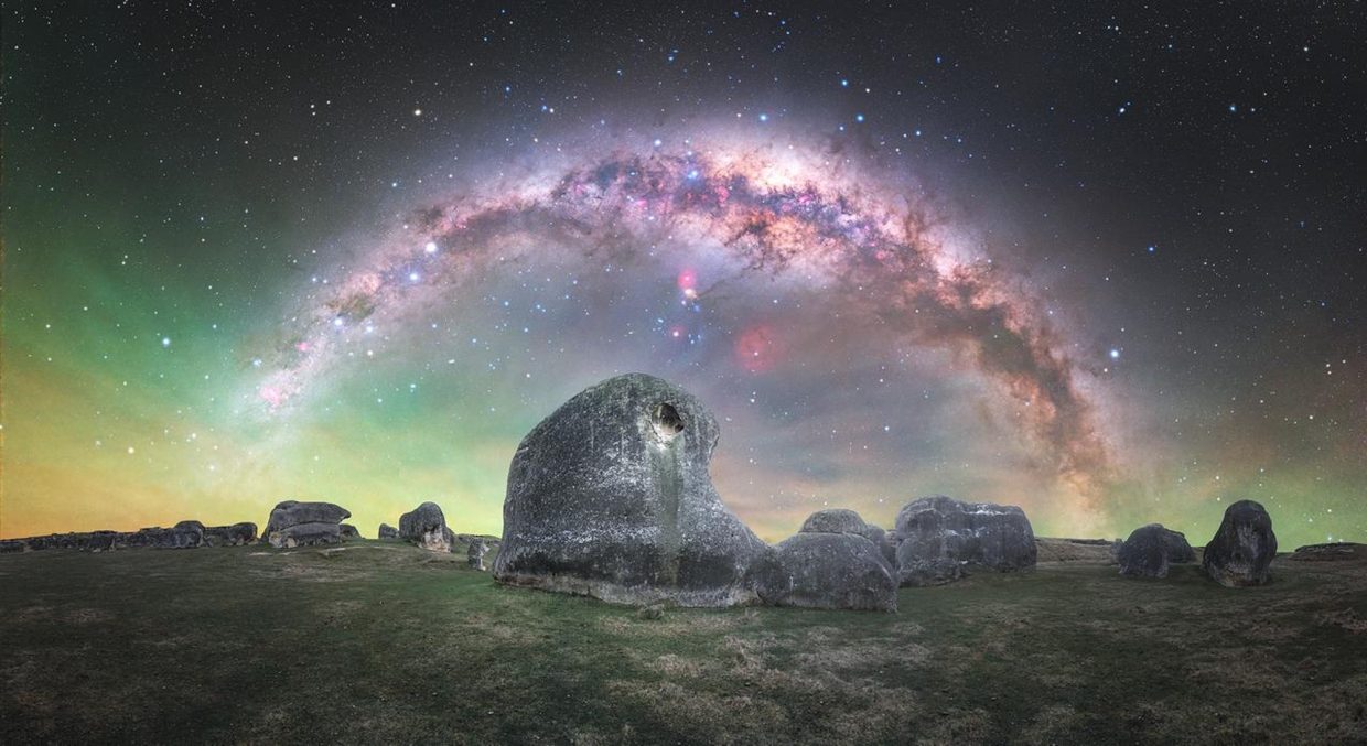 李其轩,2025年7月21日摄于 海外 新西兰奥玛鲁大象岩。尼康Z 7II(天文改机) + 适马20 1.4 Art。天空部分:ISO 6400,f/2.5,单张曝光 13秒,6张堆栈;地景部分:ISO 3200,f/1.4,单张曝光 30秒。