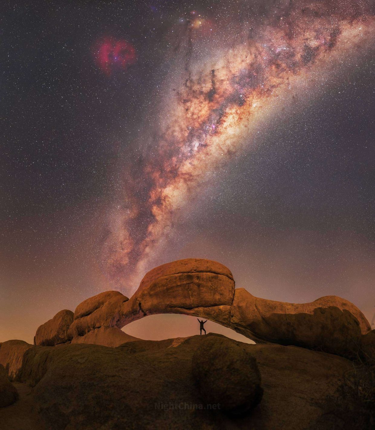 南天银河如同一道狂放不羁的金色洪流,带着宇宙初开时的原始伟力,从深邃的夜空中倾泻而下。那一刻,荒原上的石拱仿佛成了支撑苍穹的脊梁,渺小的人类张开双臂,试图在宏大的静谧中,拥抱这流淌不息的时光长河。