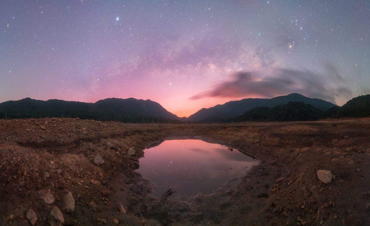 旱季的粤北高山水库里,潦水尽而寒塘清。清晨,在一湾小水潭的倒影下,横亘天际的银河在熹微晨光中逐渐消散,而绚烂的霞光正试图刺破天际。星辰与朝霞在水天之间梦幻齐舞,宛如诗人笔下那场清寒而盛大的谢幕。