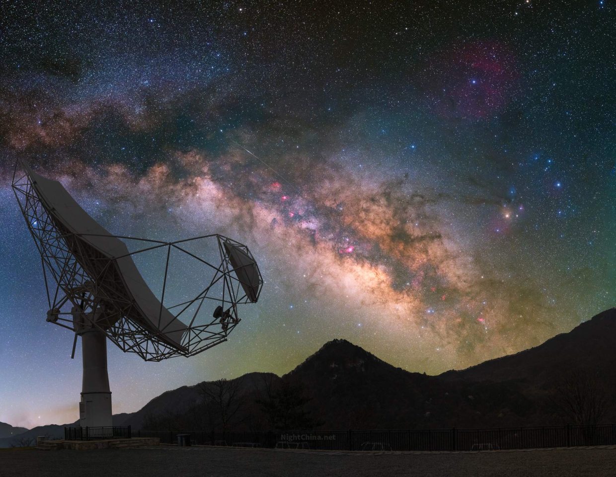 银河在山脊上方慢慢浮现,像是赴一场久别的约定。朝向星河侧身而立的射电望远镜,形似一把空椅,而整条夏季星河,恰好落座其上。人类用钢铁与算法搭起一把椅子,邀请宇宙坐下来,说说话。