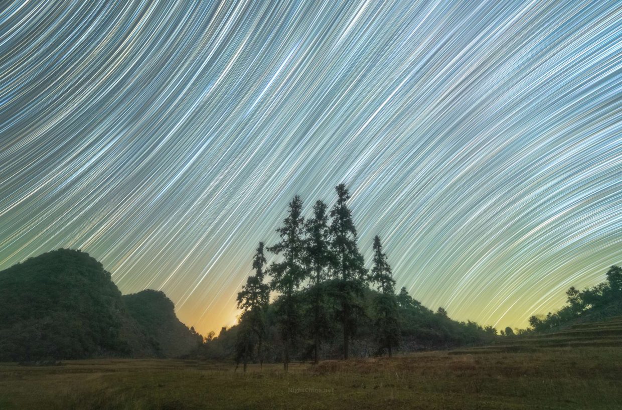地平线上那一缕暖意还没散尽,星子们已经走了很远。它们在树梢之上划出长长的银线,把一整夜的宇宙运转都压进了这片沉默的山间。时间在这里不是抽象的,而是斜斜地,一条一条,写满了整片天。