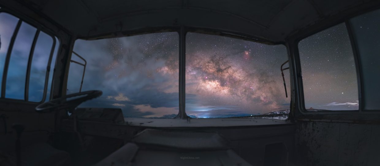 遗落在川西雪原上的旧车,不知停在这里等了多少个春秋。锈迹斑斑的窗框,成了银河最意想不到的画框。苍龙从东方云雾里悄然抬起头,星光漫卷,仿佛这辆老车此刻才没有辜负它一生的守候。
