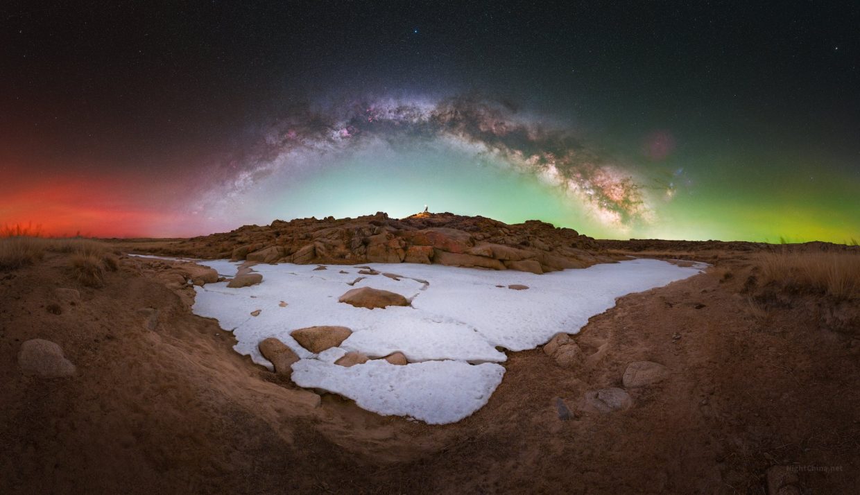 银河已在黎明前爬上夜空,弯成一道完整的拱。地面那片薄冰还没有融化,裂纹横生,静静铺在石头地里。红与绿的气辉在地平线上流淌,像是天空燃着两种颜色的火。这是一个季节叠压季节的时刻,天上已是春,地上还是冬。