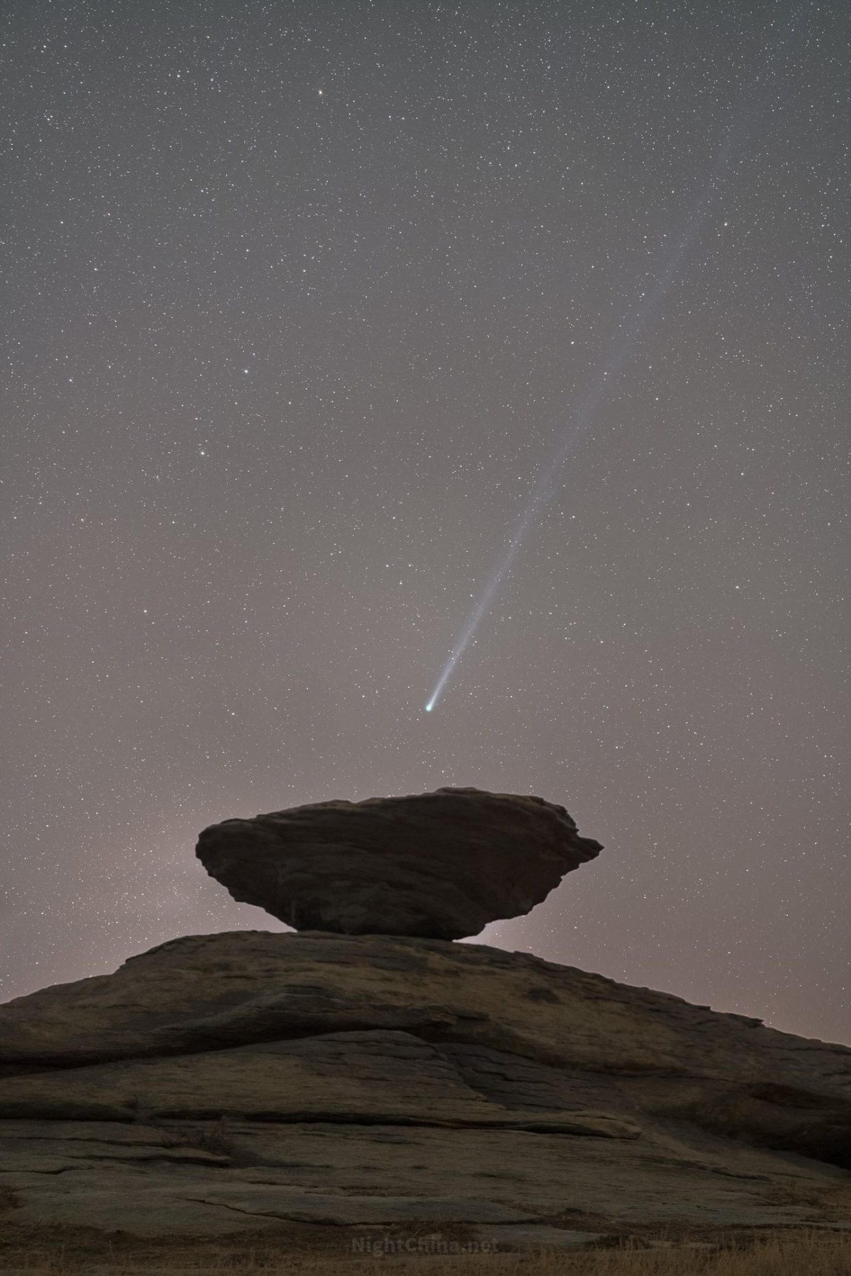不知多少年前,沧海化石,那枚平衡石便以这般姿态,静候苍穹之上的一切过客。今夜,一道白练般的光迹现身锡林郭勒的旷野。那是一颗远道而来的彗星,拖着它长长的离子尾,与古老的岩石在同一帧夜空里,彼此凝望。