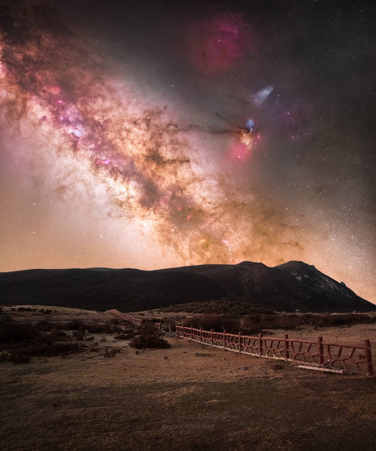 那条星河从山脊后探出身来,玫瑰色的星云如烟如霞,金橙色的银心将整片苍穹染得通透。高原的春夜尚存薄寒,木栅栏沿山脚延伸,把枯草与星空隔成两个世界,却又在漫天星光中悄然归于一体。