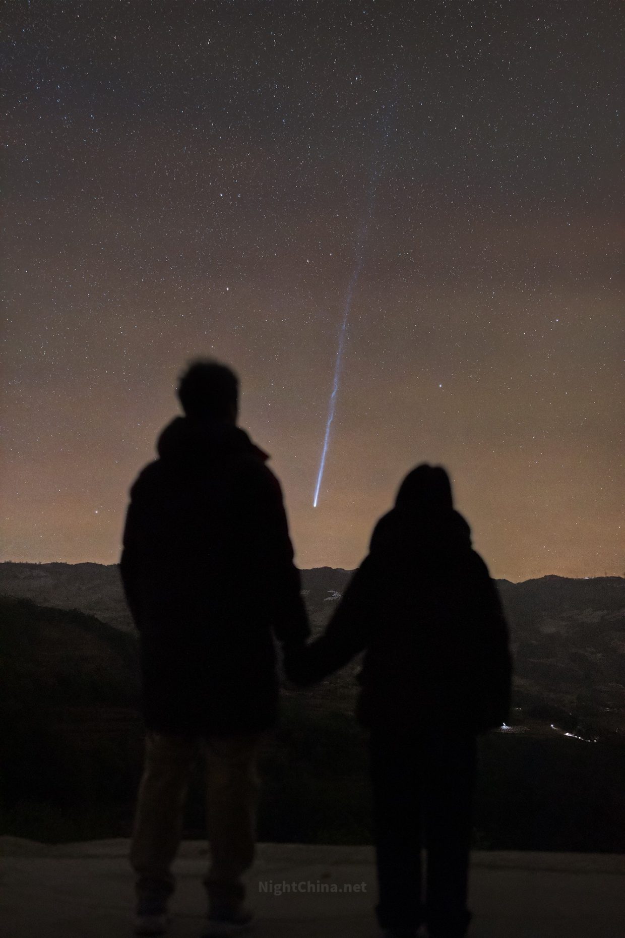 山下是人间散落的灯火,眼前是一颗正在升起的彗星。那长长的彗尾像谁在夜空里凝固的一口呼吸,悬在星河与山脊之间,安静而郑重。有些时刻无法言说,只好让彗星替你记着,我们曾在这里,牵手立于山顶。